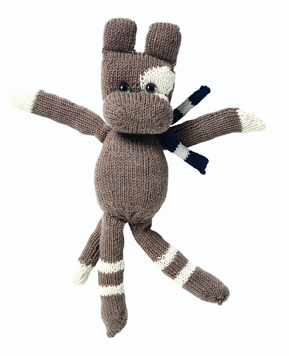 Пряжа (75% шерсти, 25% полиамида; 400 м/150 г) — по 150 г светло-коричневой, белой и синей; чулочные спицы №3,5; наполнитель для мягких игрушек; 2 пришивающихся стеклянных глаза.