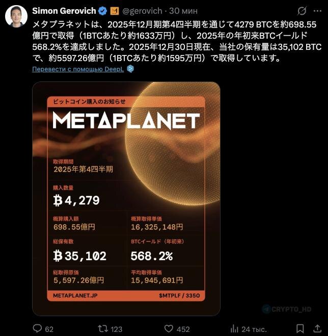 😳 Компания Metaplanet приобрела дополнительные 4279 BTC ($374m) - анонс