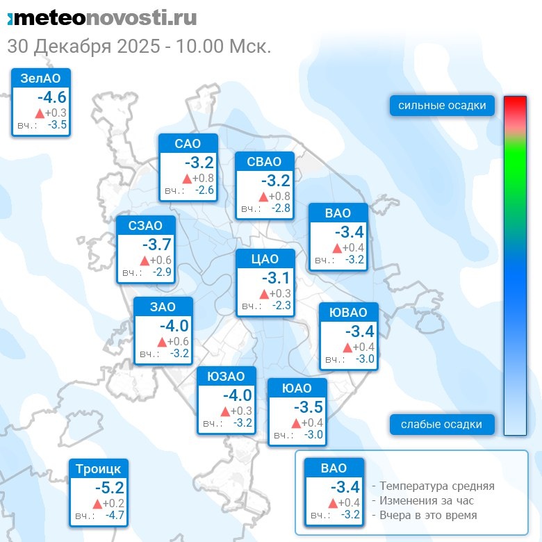 В 10:00 в Москве было от -4.8°C до -2.7°C, средняя температура -3.6°C #погода #Москва #зима #температура #30декабря #вторник