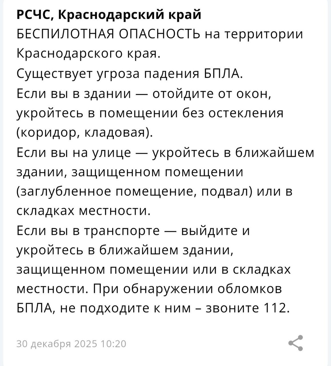 На территории Краснодарского края объявлена «Беспилотная опасность