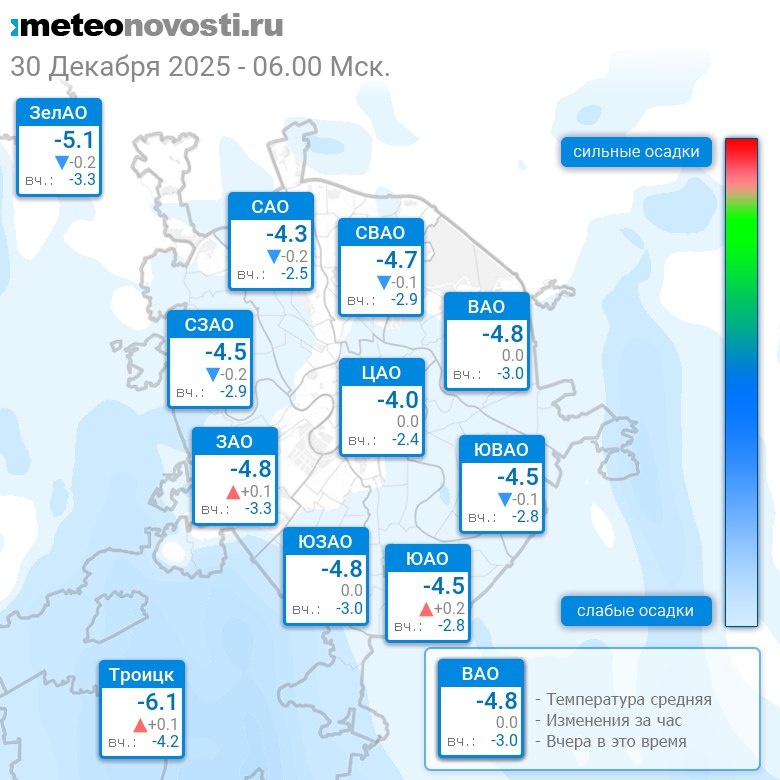 В 6:00 в Москве было от -5.5°C до -3.5°C, средняя температура -4.6°C #погода #Москва #зима #температура #30декабря #вторник