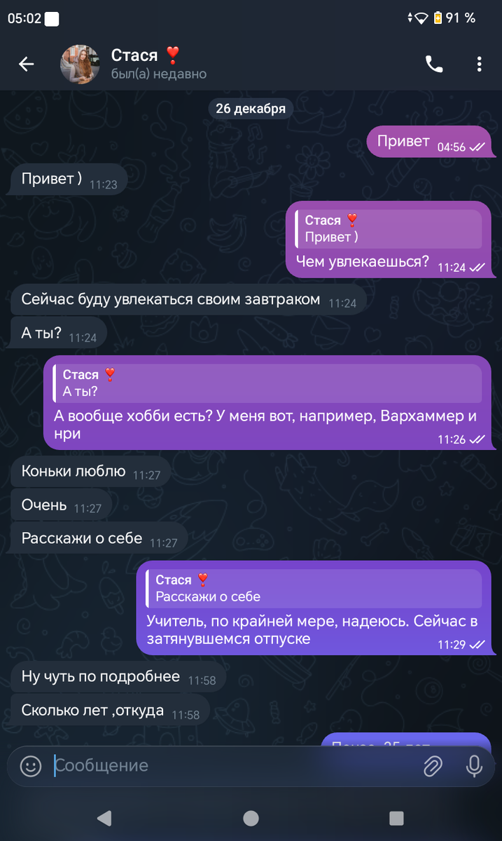 Так вот. Обычное начало общения. Говорим об увлечениях, пытаемся узнать друг друга.