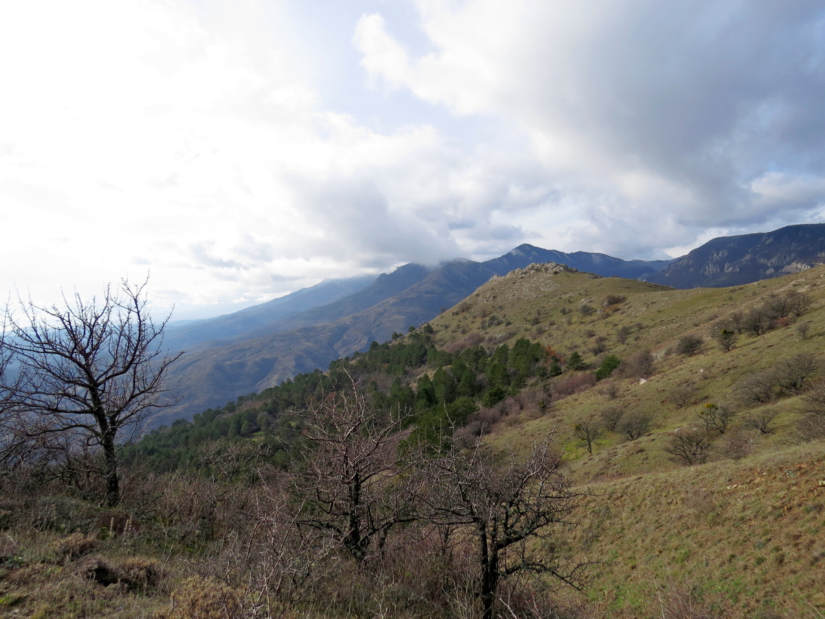 Это та самая гора, по которой мы карабкались наверх. И носит она удивительное имя - Ашага-Чулах-Кая. Что это означает в переводе, выяснить так и не удалось. В принципе, смотря на нее со стороны, прогулка не выглядит многообещающей. Но, как всегда в горах, ты знаешь, что увидишь! В прошлый раз, мы лежали на животах над обрывами и любовались открывающимся видом вон с той скальной стены на заднем плане. На горе Кыз-Кая. Теперь постоим на скальном хребте и посмотрим в разные стороны. Между вершин Хургуч и Шуври уже выглядываю вершины Караби-яйлы. мы иногда ходим на нах на рассвет, когда приезжаем туда с ночёвкой. Гора Хургуч. Справа налево - Хургуч, Шуври, Хриколь и немного видно Большие ворота. По ущелью между вершинами мы ходили прошлой зимой искать снег. Сказочная зима на перевале Алакат-Богаз В это время за спиной более спокойный пейзаж. Но, так как мы смотрим в сторону моря и солнца, там, как обычно слегка туманные пейзажи. И загадочные! Снова немножко трассы Белогорск-Приветное