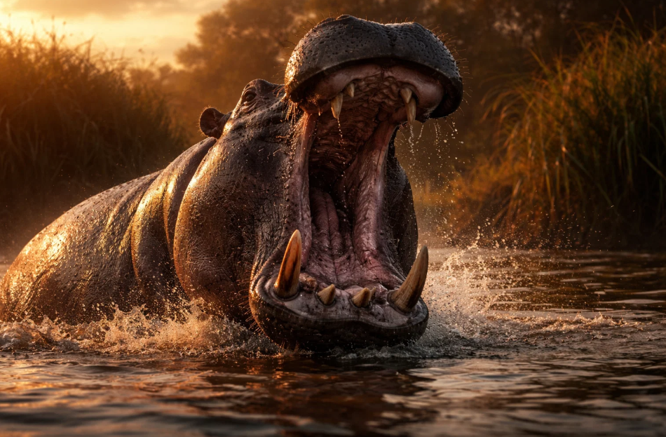 Но главное оружие гиппопотама — его пасть. Она способна раскрываться на феноменальные 150 градусов, обнажая невероятные клыки и резцы. Нижние клыки, постоянно затачивающиеся о верхние, могут достигать длины более полуметра и являются самыми крупными среди всех наземных животных. Эти бивни — не для пережевывания травы. Они — смертоносные кинжалы, предназначенные для боя. Сила укуса бегемота колоссальна, она измеряется тоннами на квадратный сантиметр. Такой укус способен перекусить пополам крупного нильского крокодила, разрезать легкую лодку или одним движением лишить жизни любого противника, буквально раздавив кости. Именно демонстрация этой пасти, зевок, который часто ошибочно принимают за признак сонливости, на самом деле является актом агрессии и предупреждением.
