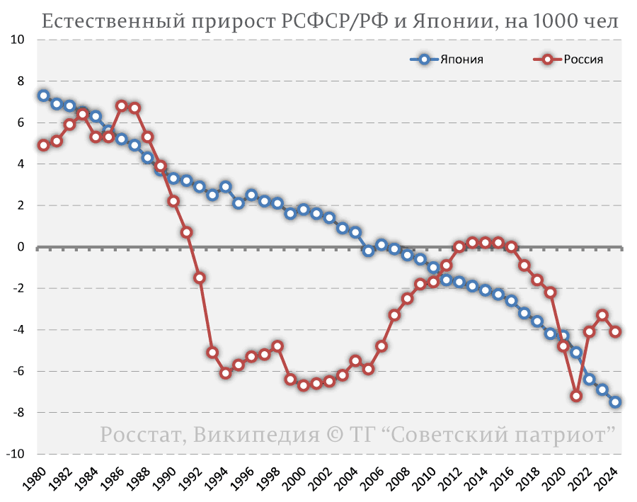 Для начала немного позитивных (с точки зрения пропаганды) новостей из стран вымирающего бездуховного Запада, а точнее Востока, т.к. речь пойдет об Японии: Рождаемость в Японии в 2025 году может снизиться до минимального уровня за весь период статистических наблюдений с 1899 года и оказаться ниже даже самых пессимистичных прогнозов правительства на фоне ускоряющегося сокращения численности населения страны. «Общее число рождений в 2025 году, вероятнее всего, опустится ниже 670 тыс., что станет новым историческим минимумом», — заявил демограф Университета Васэда Масакадзу Ямаути. Думаю, что такая новость неплохо бы прозвучала где-нибудь на пропагандистском теле-шоу, где очень любят радоваться сдохшей у соседа корове. Но всё дело в том, что аналогичные процессы происходят в самой России, где в 2025 году родилось самое маленькое число детей за всю историю наблюдений, т.е. за последние 220-230 лет. После чего демограф, рассказавший про этот неудобный факт был объявлен иностранным агентом и
