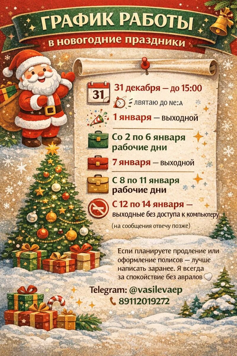 Чтобы вам было удобно планировать вопросы по страхованию, делюсь графиком 👇 🗓 31 декабря — работаю до 15:00 🎉 1 января — выходной 💼 Со 2 по 6 января — рабочие дни 🎄 7 января — выходной 💼 С 8 по 11 января — рабочие дни ⛔ С 12 по 14 января — выходные без доступа к компьютеру (на сообщения отвечу позже) 📩 Если планируете продление или оформление полисов — лучше написать заранее. Я всегда за спокойствие без авралов 🤍 Telegram: @vasilevaep 📞 89112019272 #графикработы #новогодниепраздники #страховойпредприниматель #страхованиеводнокасание