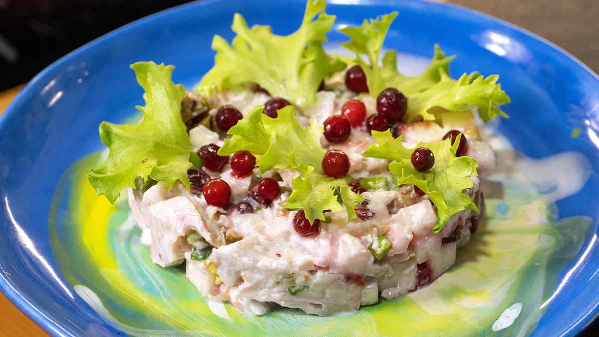 Предлагаю вашему вниманию несколько рецептов салатов с мясом на Новогодний стол Первый рецепт - «Зимняя сказка» Ингредиенты: Отделяем мясо копчёного окорочка от костей и кожи, нарезаем небольшими кусочками. Яблоко очищаем от кожуры и сердцевины, режем кубиками. Имбирь трём на мелкой тёрке, зелёный лук шинкуем. Плотную часть листьев китайской капусты (кочерыжку) нарезаем кубиками. Всё соединяем в миске. Добавляем нарезанные оливки, майонез, бруснику, поливаем небольшим количеством растительного масла и хорошо перемешиваем. Выкладываем салат на тарелку, украшаем свежей зеленью и несколькими ягодками брусники. Приятного аппетита! Ингредиенты: Кладём куриную грудку в кастрюлю, заливаем водой, солим, добавляем лавровый лист и варим около 15–20 минут до готовности. Готовую грудку вынимаем, остужаем. Пока мясо остывает, нарезаем лук и грибы, обжариваем их на растительном масле до полной готовности. Обжаренные грибы с луком перекладываем в миску, добавляем разобранное на волокна или нарезанное