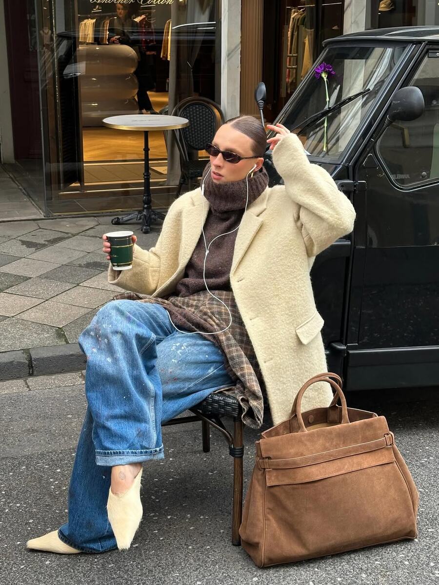 Главный шик — это когда вы смешиваете фактуры. Например, вы в джинсах и шубке, а в руках — большая замшевая сумка цвета горького шоколада. Всё, образ на миллион готов.