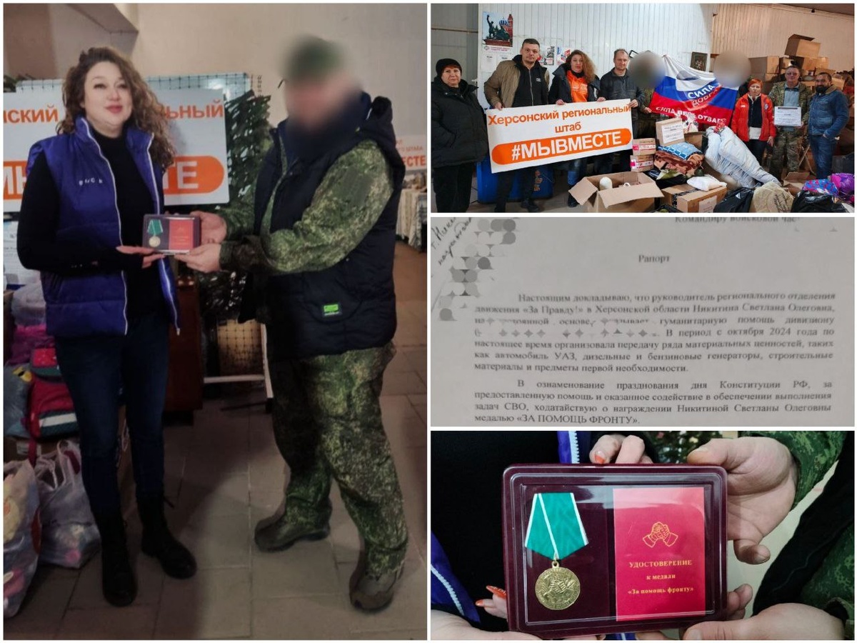 » Руководитель херсонского отделения Движения ЗА ПРАВДУ, член Совета регионального отделения партии «Справедливая Россия» и заместитель руководителя штаба #МЫВМЕСТЕ Светлана Никитина удостоена медали «За помощь фронту». Награда вручена представителями одного из боевых подразделений, выполняющих задачи на Херсонском направлении. Вручение состоялось в Геническе на базе регионального штаба #МЫВМЕСТЕ. В ходе встречи бойцам при участии волонтёрского движения «Сила добра» была передана очередная партия гуманитарной помощи: постельные принадлежности, бытовая химия, термобельё, средства гигиены, перевязочные материалы и другие необходимые принадлежности. В рапорте на награждение командир войсковой части особо отметил заслуги Светланы Никитиной в системной организации помощи фронту. В частности, была подчеркнута значимость её работы по обеспечению подразделения материальными ценностями, включая автотранспорт, генераторы, запчасти и строительные материалы. Поздравляем Светлану Олеговну с оч