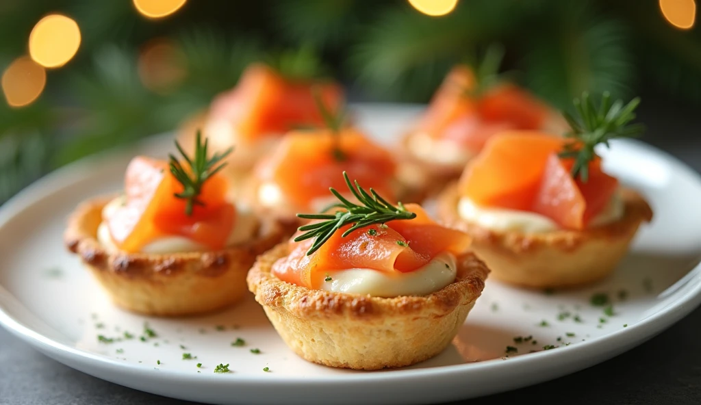 ### Новогодние тарталетки с семгой и сыром Ингредиенты: - Тарталетки готовые (можно купить замороженные) - Семга слабосоленая – 200 г - Сыр сливочный мягкий – 150 г - Укроп свежий – небольшой пучок - Лимонный сок – 1 ч.л. - Оливковое масло – 1 ст.л. - Свежемолотый черный перец – по вкусу - Морская соль – щепотка #### Шаги приготовления: 1. **Подготовка ингредиентов**: - Достаньте заранее тарталетки из морозилки, дайте немного разморозиться. - Нарежьте тонкими ломтиками семгу, положите её на тарелку. - Подготовьте сыр, натрите укроп мелко ножом. 2. **Заполнение тарталеток**: - Заполните каждую тарталетку небольшим количеством сливочного сыра. - Положите сверху тонкий кусочек семги. - Посыпьте измельченным укропом, сбрызните лимонным соком. - Полейте оливковым маслом, добавьте свежемолотого черного перца и морской соли по вкусу. 3. **Оформление блюда**: - Подайте тарталетки сразу же после заполнения, пока начинка свежая и ароматная. - Оформите блюдо зеленью, лимоном или дольками огурца.