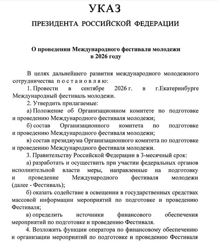 Президент РФ Владимир Путин подписал указ о проведении «Всемирного фестиваля молодёжи» 2026 года в Екатеринбурге. Документ опубликован на сайте Кремля. При этом фестиваль должен был пройти в Красноярске. Планировалось, что фестиваль соберёт 10 тыс. человек в возрасте от 14 до 35 лет, половина из которых — зарубежные гости. Летом 2025-го губернатор Михаил Котюков («Единая Россия») сообщал о планах ускорить приведение Красноярска в порядок за счет подготовки к фестивалю, а в октябре рассказывал о поддержке проведения фестиваля со стороны Путина. Ранее власти РФ не утвердили Новосибирск «Культурной столицей» страны на 2027 год, несмотря на победу в общем голосовании. Также вопросы к честности конкурса на звание «Молодёжной столицы России» возникли у жителей Томска, в том числе у депутата Госдумы от «Единой России». Подписаться| Прислать новость| Помочь бустами