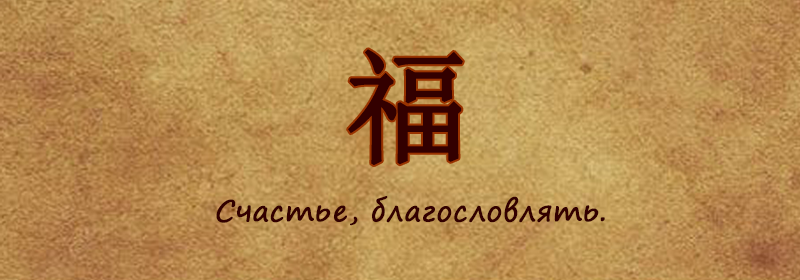 Впервые иероглиф 福 появляется в гадательных надписях на костях времён династии Шан. Левая часть иероглифа – символ «示», напоминающий алтарь и обозначающий родовую табличку. Рядом с ним иероглиф «酉», означающий кувшин с вином, к которому иногда пририсовывались две держащие его руки. Весь иероглиф означает подношение кувшина родовой табличке и молитву об удаче. В бронзовых надписях иероглиф изменяется. Исчезают руки, держащие кувшин, сам кувшин упрощается. В некоторых вариантах появляется крыша «宀», вероятно, указывающая на молитву о благословении дома. Иногда алтарь оказывается под кувшином, а рядом добавляются две фигуры, стоящие спина к спине – «北», что является фонетическим компонентом. В малом уставе, введённом при династии Цинь, левую часть иероглиф берет из варианта бронзовой надписи, сохраняя значение, а винный кувшин преобразуется в иероглиф «畐», обозначая звучание. В этом виде он и перешёл в канцелярское письмо династии Хань. Первоначальное значение «福» – «поиск удачи». Удачу и