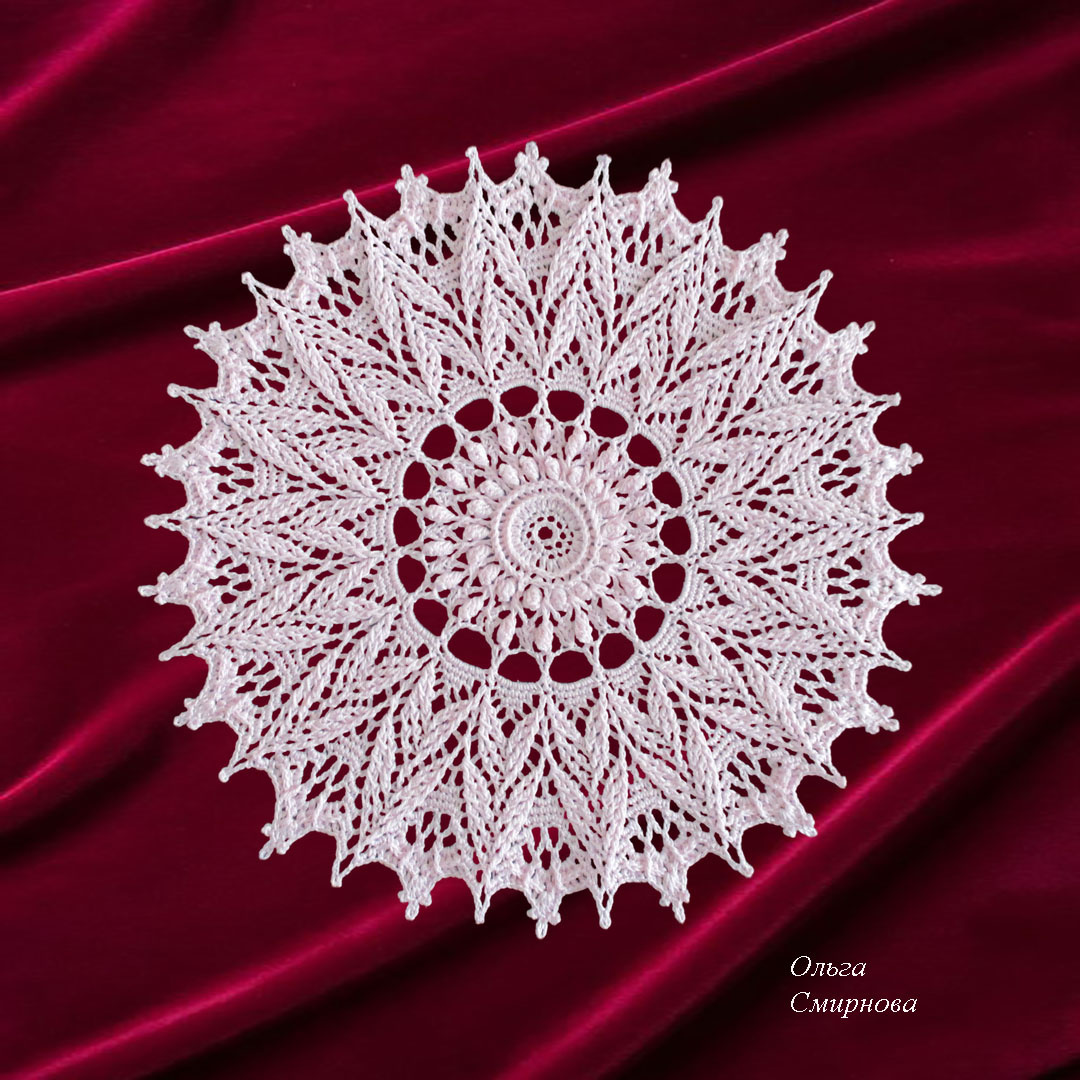 Не знаю почему, пришло мне в голову именно это название - "Зимняя вишня", может из-за попкорнов - ягодок и "еловых веточек" в кайме. Салфетка вышла маленькая (27 см, нитки "пехорка ажурная" (50г/280м, 30 грамм), крючок 1,25 мм). Во время вязания фалдила и плотный узор как то немного смущал. Но после блокирования все встало на свои места и рисунок раскрылся.