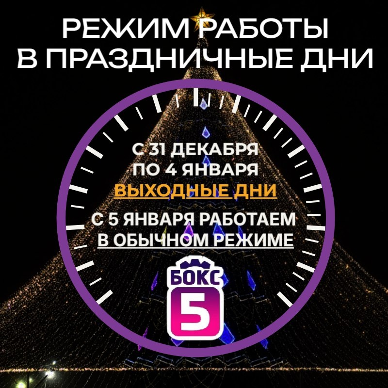 Выходные дни (оба филиала) - с 31 декабря по 4 января включительно. С 5.01.2025 оба филиала возобновляют работу в обычном режиме. Мы искренне желаем вам хорошего новогоднего настроения, пусть ваши поездки всегда будут комфортными и безопасными, а автомобиль - в отличном состоянии! Ваш БОКС5 ❤️❄️