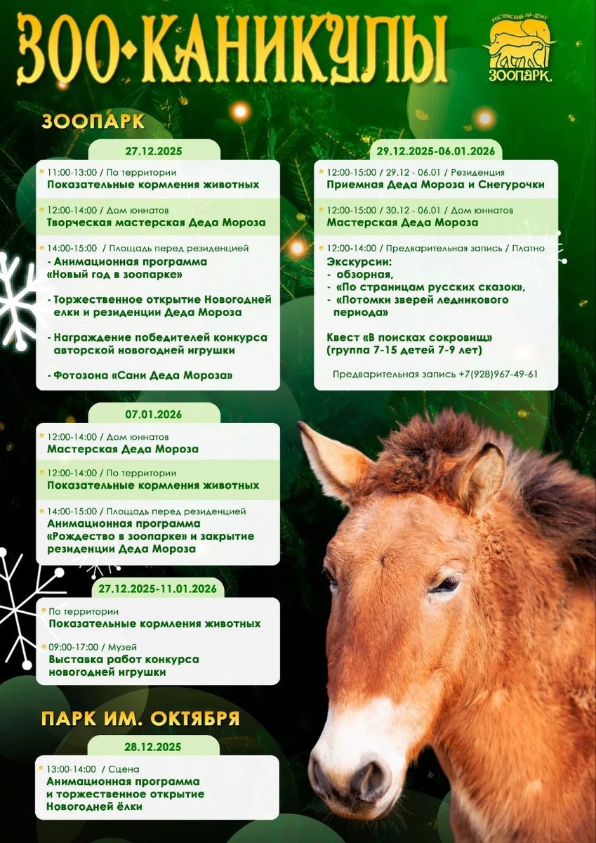 Все новогодние выходные дни у нас каждому найдется занятие по интересам! 🎄 Каждый день с 29 декабря по 6 января 12.00-15.00 в Резиденции ведут прием детей 🎅 Дед Мороз и Снегурочка. Праздничный сюрприз - бесплатный 🎁 подарок тому, кто прочтет стих, споет или 💃🕺 станцует. 🎄 Каждый день с 29 декабря по 11 января показательные 🌿🍏 кормления животных, а также по предварительной записи (+7(928)967-49-61): 💫 экскурсии: Обзорная, «По страницам русских сказок» (5-7 лет), «Потомки зверей ледникового периода» (8-12 лет); ✨ квест «В поисках сокровищ» (группа 7-15 детей 7-9 лет). 🎄 С 30 декабря по 6 января 12.00-15.00 в Доме юннатов работает сказочная 🎨🖌️ мастерская. 🎄 7 января приглашаем отметить «Рождество в зоопарке!»: 🌟 12.00-14.00 в Доме юннатов – сказочная мастерская, 🌟 14.00-15.00 перед избой – программа «Рождество в зоопарке» и закрытие резиденции Деда Мороза. (👉 Участие в мероприятиях по билету 🎟️ в зоопарк, на квест - дополнительный 🎫 билет). 🎄 8 января в парке им. Октяб