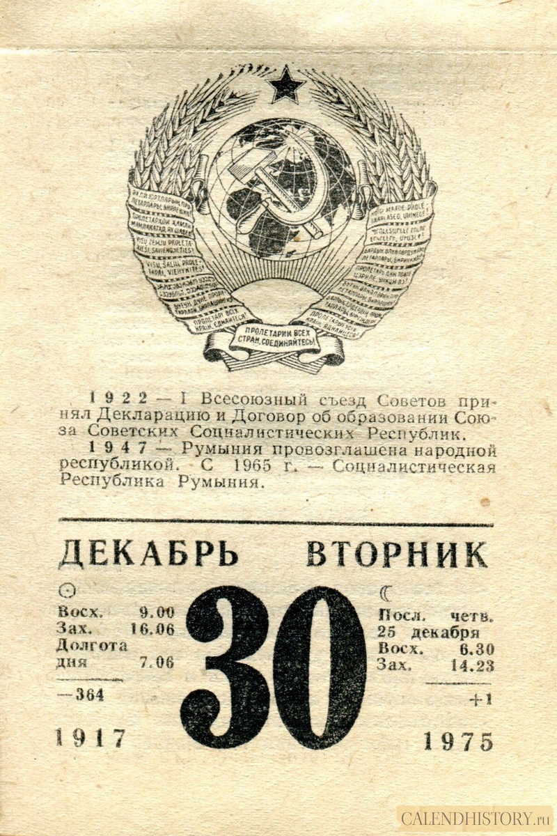 30 декабря 1975-го года — Календарь для женщин 1922 — I Всесоюзный съезд Советов принял Декларацию и Договор об образовании Союза Советских Социалистических Республик. Больше старых советских отрывных календарей смотрите у нас на сайте - calendhistory.ru 1947 — Румыния провозглашена народной республикой. С 1965 г. — Социалистическая Республика Румыния. https://calendhistory.ru/30-dekabrja-1975-go-goda-kalendar-dlja-zhenshhin/