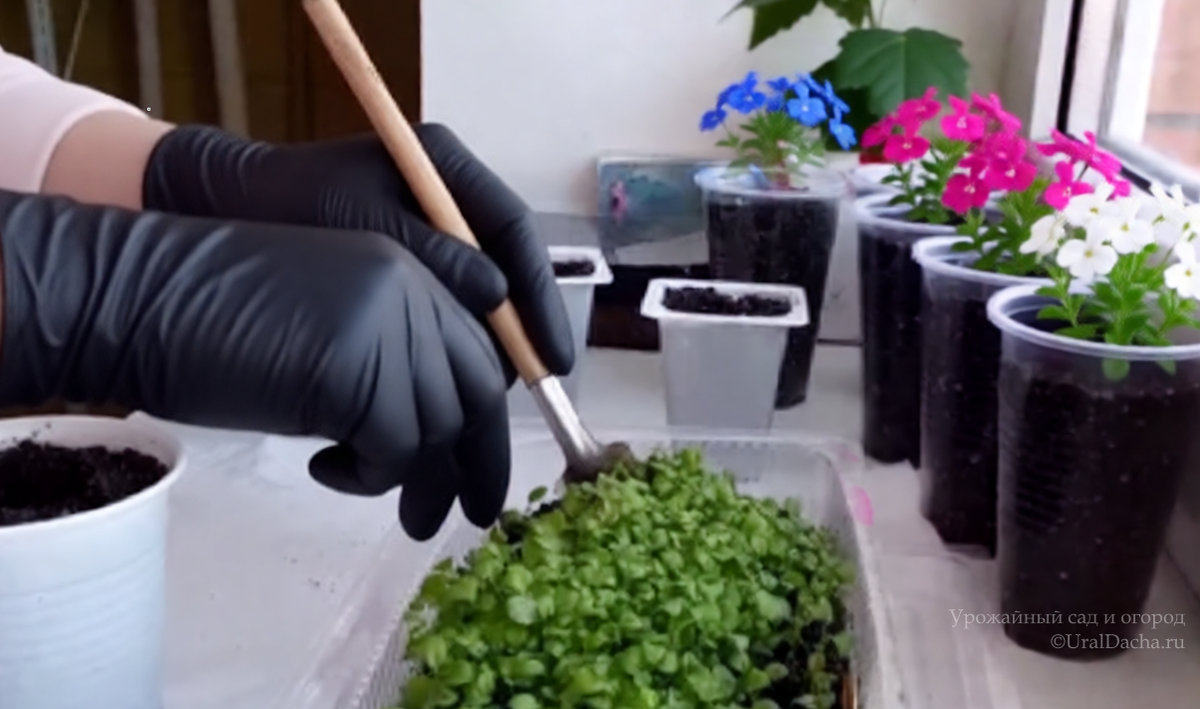 - Если в общий лоток — поддевайте рассаду кучками чайной ложкой или одноразовой вилкой, стараясь не повредить корни. Можно даже нарезать «порционно», как пирог, и пересаживать блоками.