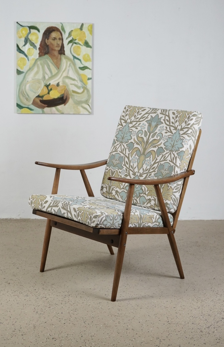 Корпус тщательно очищен от старого покрытия и окрашен в светлый оттенок ореха. На спинке восстановлена утраченная деталь.