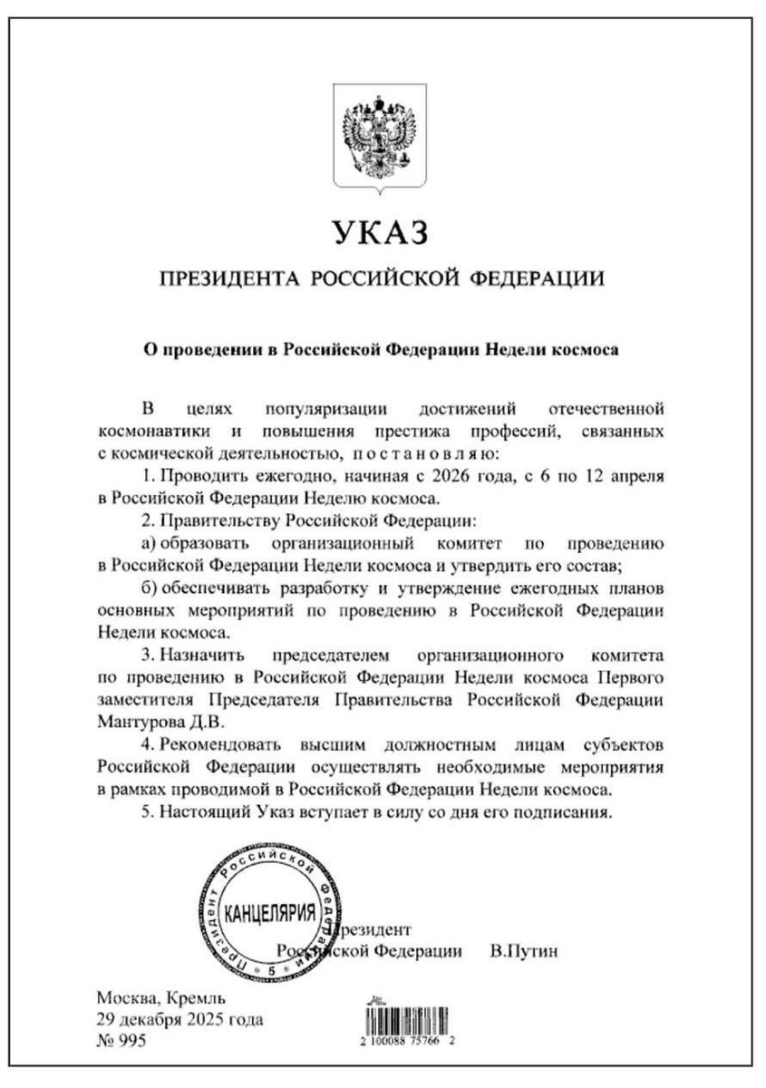 Соответствующий указ подписал Президент РФ Владимир Путин. В 2026 году неделя будет посвящена 65-летию полёта Юрия Гагарина в космос. Для проведения Недели космоса будет создан оргкомитет, его возглавит Первый заместитель Председателя Правительства РФ Денис Мантуров. Неделя космоса-2026 — это ряд мероприятий, посвящённых космонавтике. Они направлены на популяризацию достижений и повышение престижа отечественной ракетно-космической отрасли.