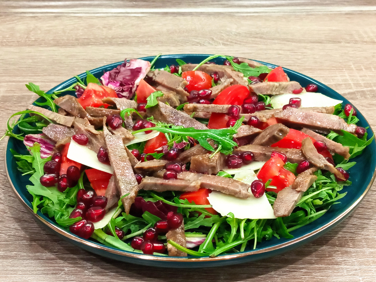 Выложить на большое блюдо: руккола, мясо нарезанное брусочками или слайсами, дольки помидор, слайсы сыра, посыпать зернами граната и полисть соусом.