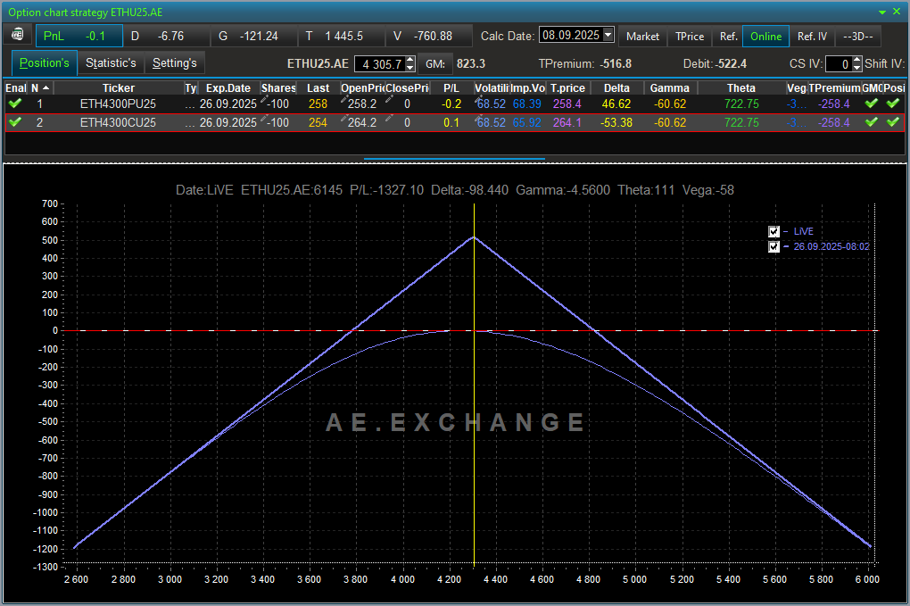 Вот, как говориться "классика жанра". Проданный стредл на квартальную серию ETH в количестве по 100 штук путов и коллов. Может быть собран и так, а можно собрать и синтетически, задействовав фьючерс и опцион.