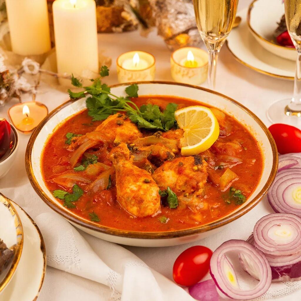 Ингредиенты: Курица (или индейка) — 1 кг Репчатый лук — 3 шт. Помидоры свежие — 500 г Чеснок — 3 зубчика Кинза свежая — небольшой пучок Зелень петрушки — небольшой пучок Перец чили свежий — 1 стручок (по желанию) Специи: Хмели-сунели — 1 чайная ложка Уцхо-сунели (шафрановая приправа) — ½ чайной ложки Кориандр молотый — ¼ чайной ложки Черный перец свежемолотый — щепотка Соль морская крупная — по вкусу Растительное масло — 3 столовые ложки Вода питьевая кипяченая — около стакана Инструкция приготовления: Подготовка продуктов: Промойте курицу и порежьте её крупными кусочками (бедра, голени, грудки). Очистите репчатый лук и мелко нарежьте. Свежие помидоры ошпарьте кипятком, снимите кожуру и измельчите блендером или натрите на терке. Нарубите чеснок ножом. Мелко порубите кинзу и зелень петрушки. Подготовьте специи. Процесс готовки: Разогрейте сковороду с растительным маслом и обжарьте кусочки курицы до золотистой корочки на среднем огне примерно 8 минут. Добавьте нарезанный лук и ж