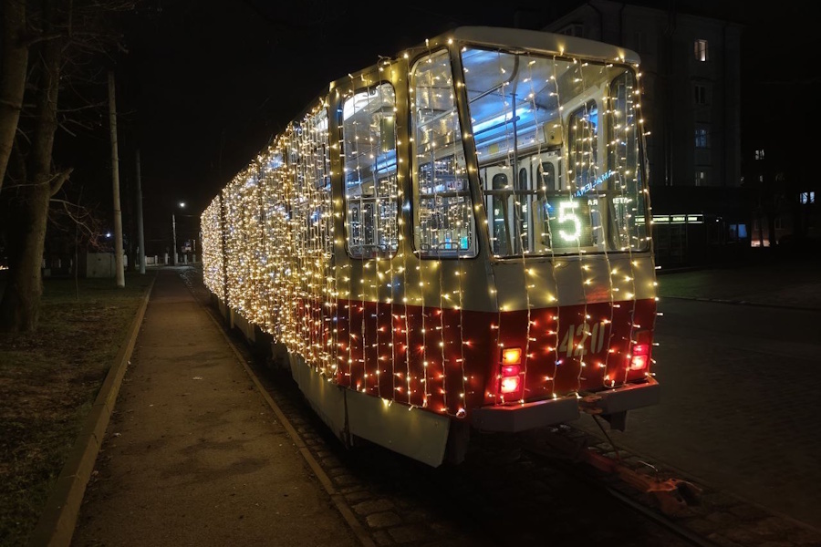В Калининграде к новогоднему трамваю Tatra (маршрут № 5) добавился украшенный гирляндами «Корсар» (маршрут № 3). В целом же, число светящихся единиц общественного транспорта, как сообщили «Новому Калининграду» в «КалининградГорТрансе», увеличено до четырёх единиц. «На линии работает два трамвая в огнях, и по одной единице троллейбуса и автобуса», — уточнили в пресс-службе предприятия. Фото: Иван Марков / «Новый Калининград» Напомним, что впервые в этом сезоне новогодний трамвай вышел на линию 22 декабря. В пресс-службе мэрии города «Новому Калининграду» пояснили, что новогодний трамвай ранее не выходил в рейс из-за перегоревших гирлянд. «Закупили новые гирлянды. Теперь трамвай курсирует, как и раньше», — уточняли в мэрии. Напомним, что в конце 2023 года новогодний трамвай курсировал поочередно по маршрутам № 3 и № 5 с 30 декабря по 8 января. Кроме того, с 30 декабря до 2 января в праздничных трамваях действовала акция «Счастливый билетик»: каждому сотому пассажиру доставался специальны