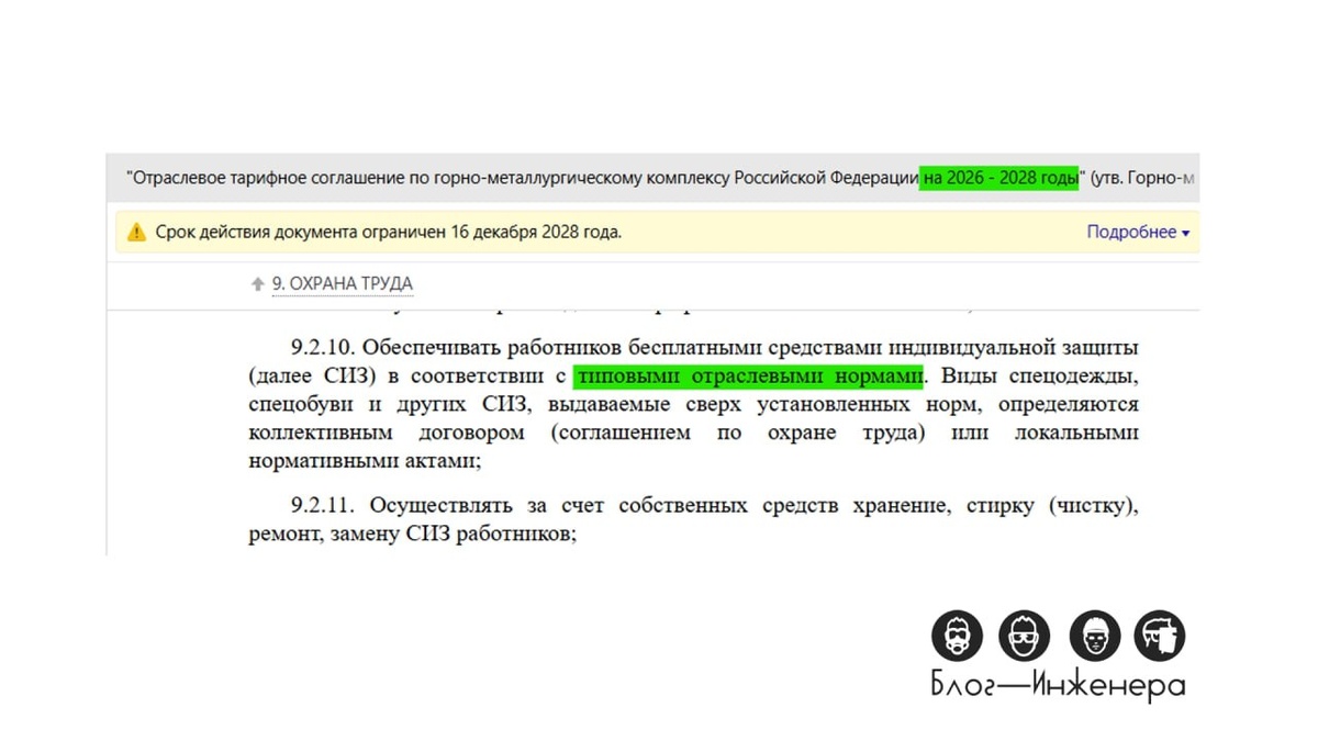 (см. скрин) Общеизвестно, что с 1 сентября 2023 года применяется ЕТН и Правила обеспечения СИЗ. «Отраслевое тарифное соглашение по горно-металлургическому комплексу Российской Федерации на 2026 - 2028 годы» утвердили: ✅ Горно-металлургический профсоюз России; ✅ Общероссийское отраслевое объединение работодателей «Ассоциация промышленников горно-металлургического комплекса России». ❗️Соглашение зарегистрировано в Роструде, № 35/26-28 от 25.12.2025 г. На «Угле и Майнинге — 2026» у нас будут вопросики. Блог—Инженера для людей ❤️ ⭐️ Сервисы ⚡️ Проголосовать