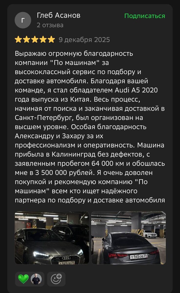 👍 🔵🔵🔵🔵🔵 👍 Читая подобные отзывы, мы понимаем что работаем непросто так. Ведь ваши позитивные эмоции это лучший "кешбэк" в нашем деле! ❤️ Благодарим Глеба за оказанное доверие и желаем в новом 2026 году новых ярких эмоций и ни гвоздя, ни жезла 🥳 📨 Пишите "ПО МАШИНАМ" – мы привезем авто вашей мечты с большой выгодой! ✍️МЕНЕДЖЕР ЗАХАР ☎️ +7(902)481-18-22 🗺 Отзывы 🚗 Каталог Дром 📷 YouTube канал с обзорами 🟦 Сообщество VK