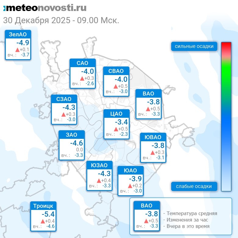 В 9:00 в Москве было от -5.4°C до -2.9°C, средняя температура -4.1°C #погода #Москва #зима #температура #30декабря #вторник
