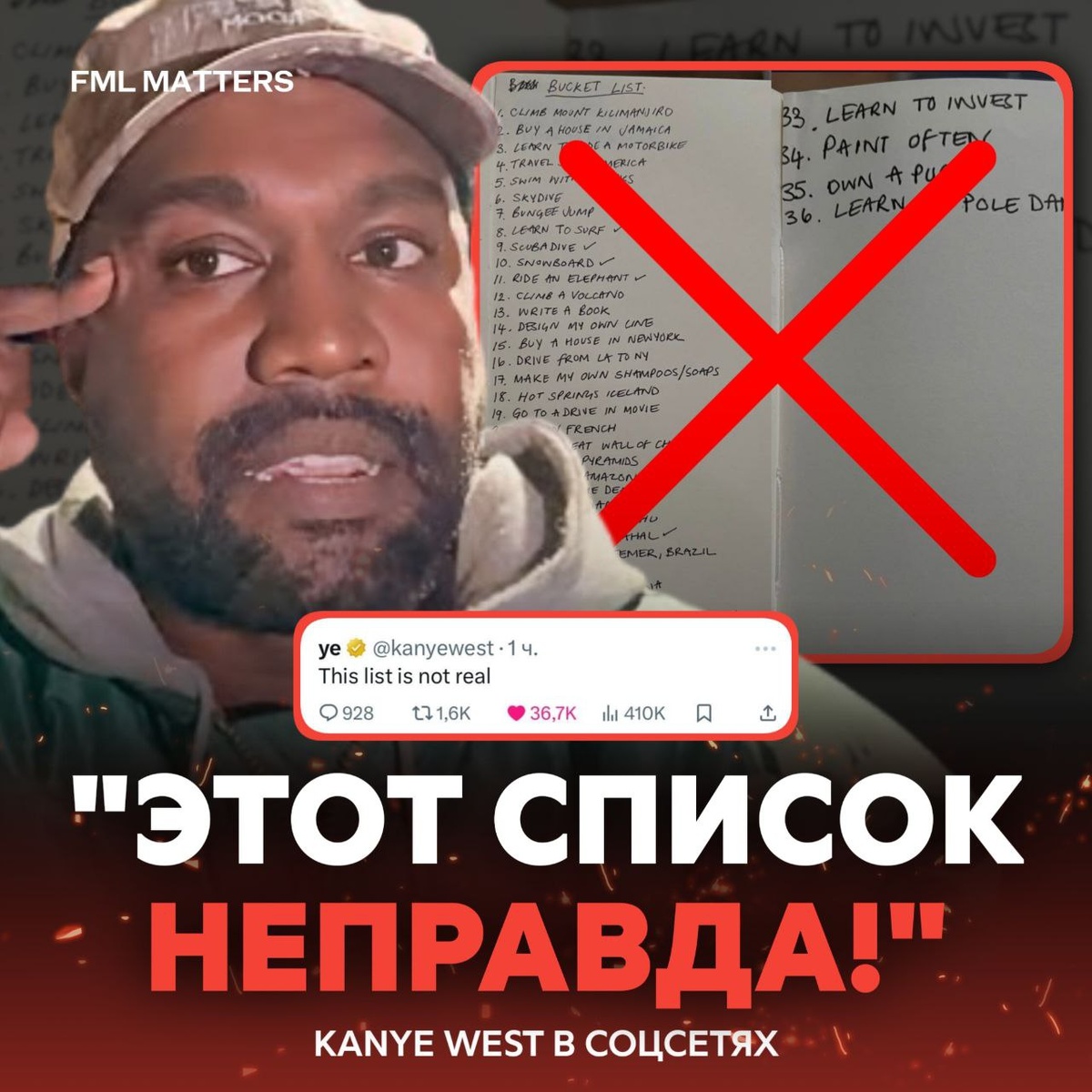 ❌ KANYE WEST НАЗВАЛ СПИСОК ЖЕЛАНИЙ ФЕЙКОМ! Ранее ставший вирусным список из 36 жизненных целей, приписываемых Канье Уэсту, оказался фейком. Сам Йе заявил, что не публиковал такого перечня и это не его почерк. Среди самых неожиданных пунктов в списке было: путешествие по России, завести мопса, вычить французский, научиться танцевать на пилоне 💀 FML MATTERS