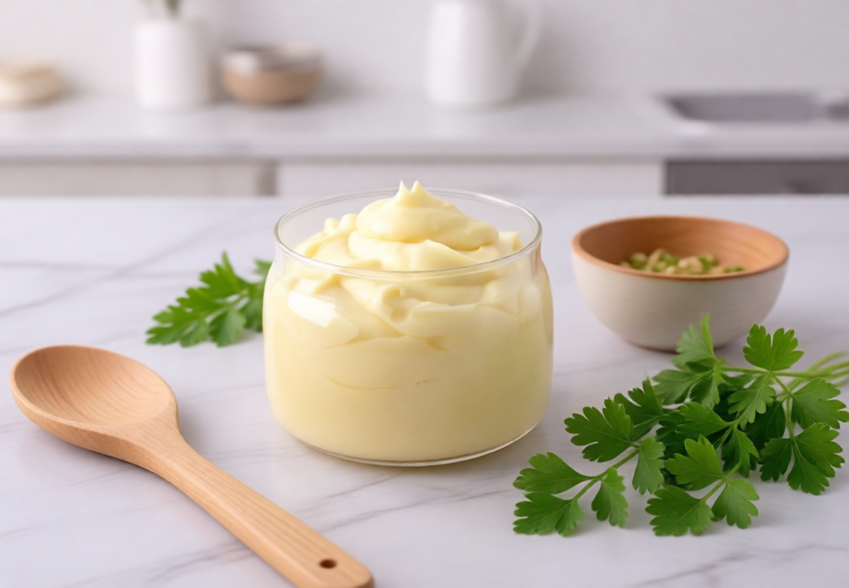 Совет: Смешайте 150 мл подсолнечного и 50 мл оливкового легкого масла для аромата без горечи. - Посуда: Протрите все инструменты уксусом — даже капля воды на стенках разрушит эмульсию.