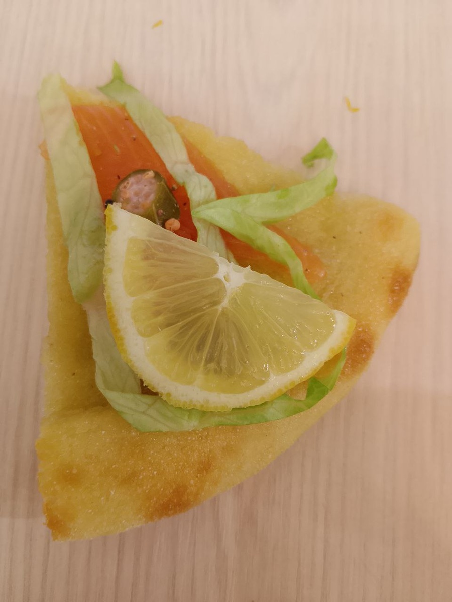 - Вытащите сковороду из духовки, затем лопаткой вытащите пиццу на решетку, перенесите на разделочную доску и нарежьте хлебным ножом на 6 кусочков. Верните их обратно в сковороду, добавьте смесь рикотты с помощью кондитерского мешка. Выложите сверху рыбу, добавьте лук и листья салата. Поперчите и сбрызните оливковым маслом. Приятного аппетита!