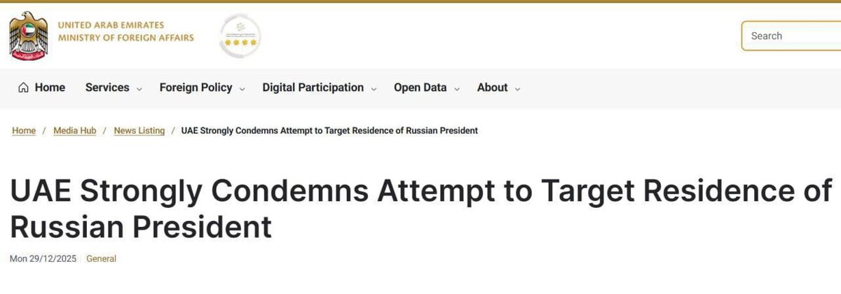 МИД ОАЭ максимально жестко оценил попытку атаки украинских БПЛА на резиденцию президента РФ. Назвав произошедшее «гнусным нападением», Абу-Даби четко дал понять, что подобные акции являются прямой угрозой международной безопасности и стабильности, которую Эмираты ценят превыше всего. «ОАЭ решительно осуждают подобные действия», — подчеркивается в официальном заявлении. Сайт "Другая Украина" / Telegram / Вконтакте / Центр поддержки Украинцев / Жалоба на ТЦК 🇷🇺"Другая Украина" теперь в МАХ