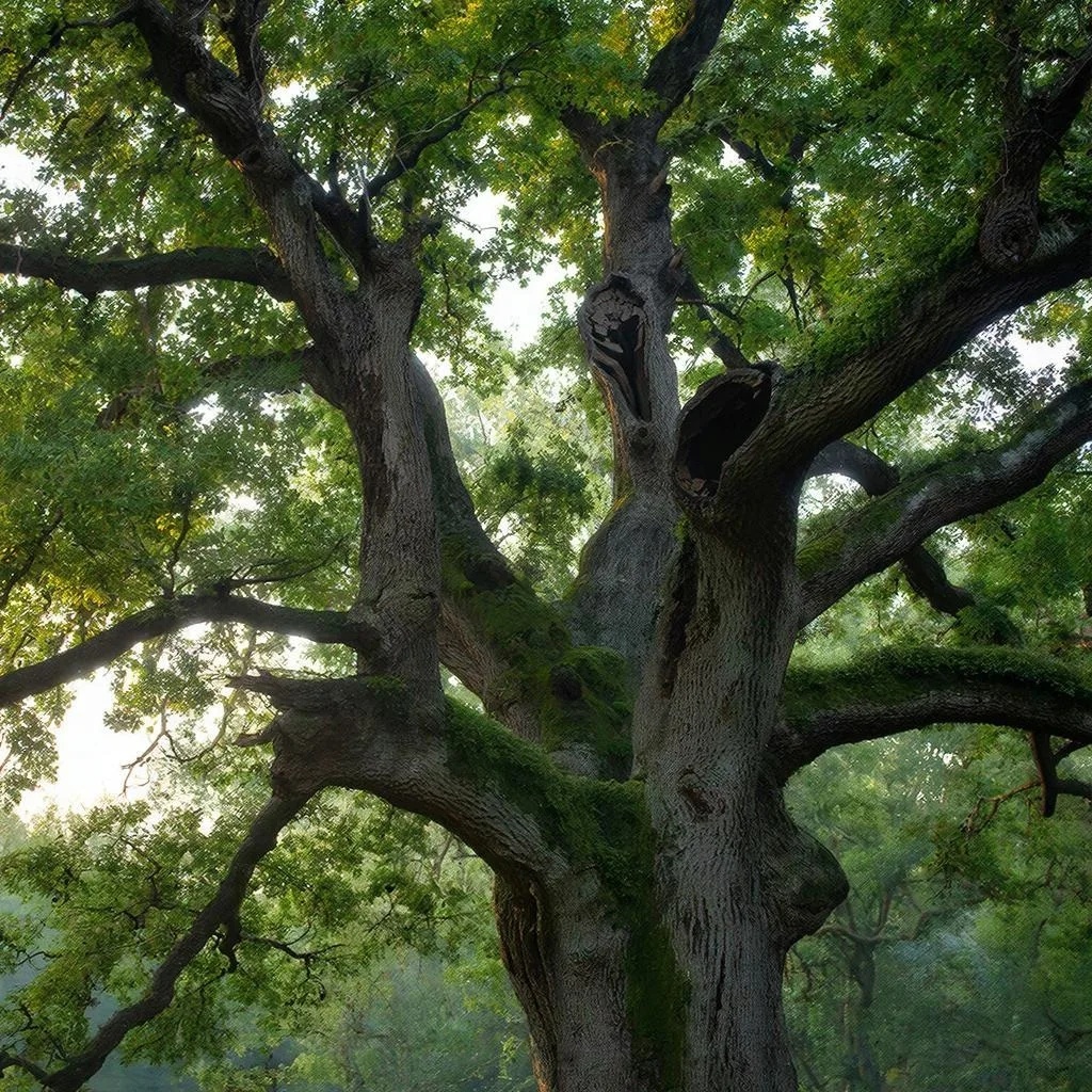 его ветви склонены к земле, но ствол стоит непоколебимо. У его подножья — глубокие, уходящие в темноту корни.