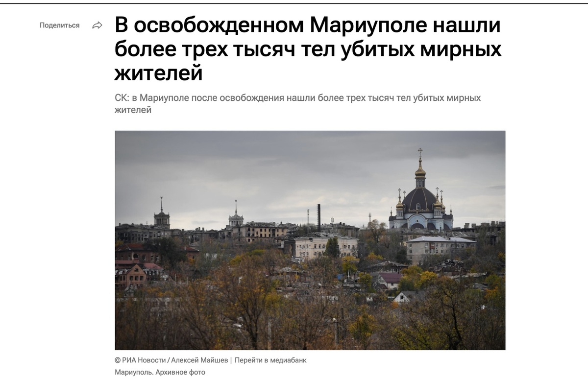 «Не имея возможности покинуть город и перемещаясь в поисках пропитания, мирные жители стали живой мишенью для украинских карателей, которые убивали их из различных видов вооружения. Так, только в апреле 2022 года на оставленных украинскими войсками позициях были обнаружены тела 51 мирного жителя, а уже после полного освобождения и обследования города их количество составило более 3 тыс.», — говорится в сообщении.