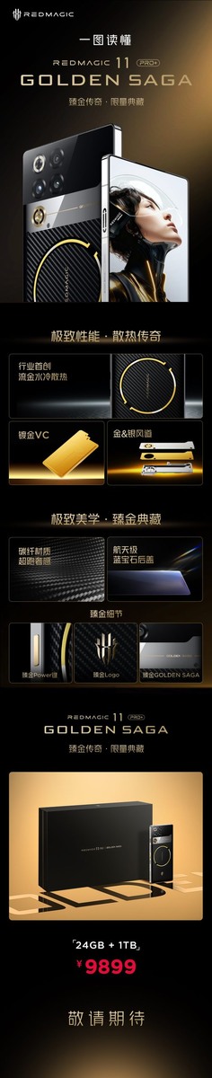 Nubia анонсировала ограниченную версию смартфона RedMagic 11 Pro+ Golden Saga с уникальным дизайном и мощной начинкой. — Аккумулятор: 7500 мА·ч — Зарядка: 120 Вт проводная, 80 Вт беспроводная — Дисплей: 6,85" Wukong Screen 2.0, 144 Гц — Фронтальная камера: 16 Мп, под экраном — ОЗУ: 24 ГБ — Флеш-память: 1 ТБ — Система охлаждения: Wind & Water Dual Cooling с вентилятором 24 000 об/мин — Цена: около 1400 долларов в Китае 👉 Tech leaks в Telegram | Дзен