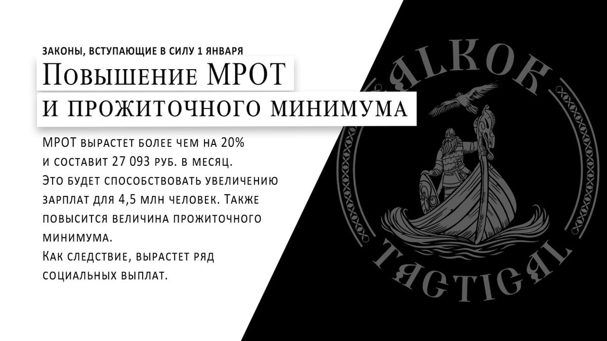 С нового года в России начинают действовать сразу несколько важных законодательных новшеств, которые повлияют на доходы и социальные выплаты граждан. Минимальный размер оплаты труда (МРОТ) С 1 января МРОТ увеличится более чем на 20% — он составит 27 093 рубля в месяц. Работодатели обязаны применять эту новую цифру при расчёте зарплат и ряда выплат. Индексация страховых пенсий Страховые пенсии вырастут на 7,6%. Повышение коснётся как пенсионеров, которые уже не работают, так и тех, кто продолжает трудовую деятельность. Социальные пособия и прожиточный минимум Прожиточный минимум также будет пересчитан, что влияет на расчёт социальных выплат, доплат и мер поддержки. Поддержка семей с детьми Расширяются меры помощи семьям: • снимаются ограничения на включение в страховой стаж периодов ухода за ребёнком до 1,5 лет; • вводится новая ежегодная выплата для работающих родителей, воспитывающих двух и более детей. Признание «Мать-героиня» Женщины, удостоенные звания «Мать-героиня», теперь б