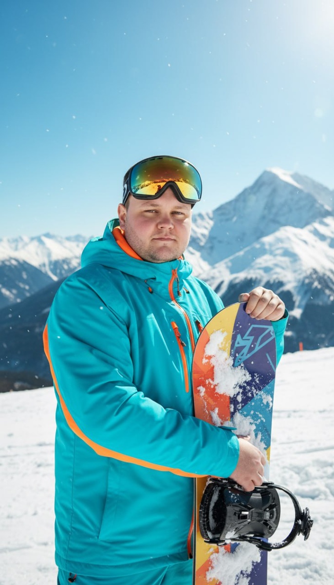🔥 Добавляем сочных красок в горы! Никакого мрачного нуара — только ослепительное солнце, неоновый шмот и кристально чистый снег. Делаем из обычного селфи кадр, который выглядит как обложка спортивного глянца. Закидываем фото в бот @SnapToVideo_bot и взрываем ленту. ⚡️ Используя загруженное селфи как точный референс лица с полным сохранением всех черт и идентичности на 100%, создай фотографию по описанию, сохраняя абсолютное сходство лица. Фотореалистичный и супер-сочный [портрет по пояс] мужчины на [заснеженном горном склоне]. Он [уверенно позирует, держа яркий сноуборд в руках]. Одежда: [ярко-бирюзовая технологичная куртка с неоново-оранжевыми вставками, на лбу — профессиональная горнолыжная маска с зеркальным золотым покрытием, в котором отражаются горы]. Лицо полностью открыто, на щеках легкий румянец от мороза. Освещение: [ослепительно яркий солнечный свет, создающий искрящиеся блики на снегу и насыщенные цвета]. На фоне [ярко-синее безоблачное небо и величественные белоснежные