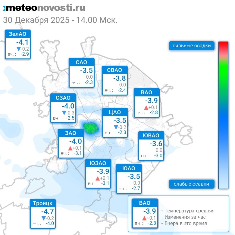В 14:00 в Москве было от -4.7°C до -3.1°C, средняя температура -3.8°C #погода #Москва #зима #температура #30декабря #вторник