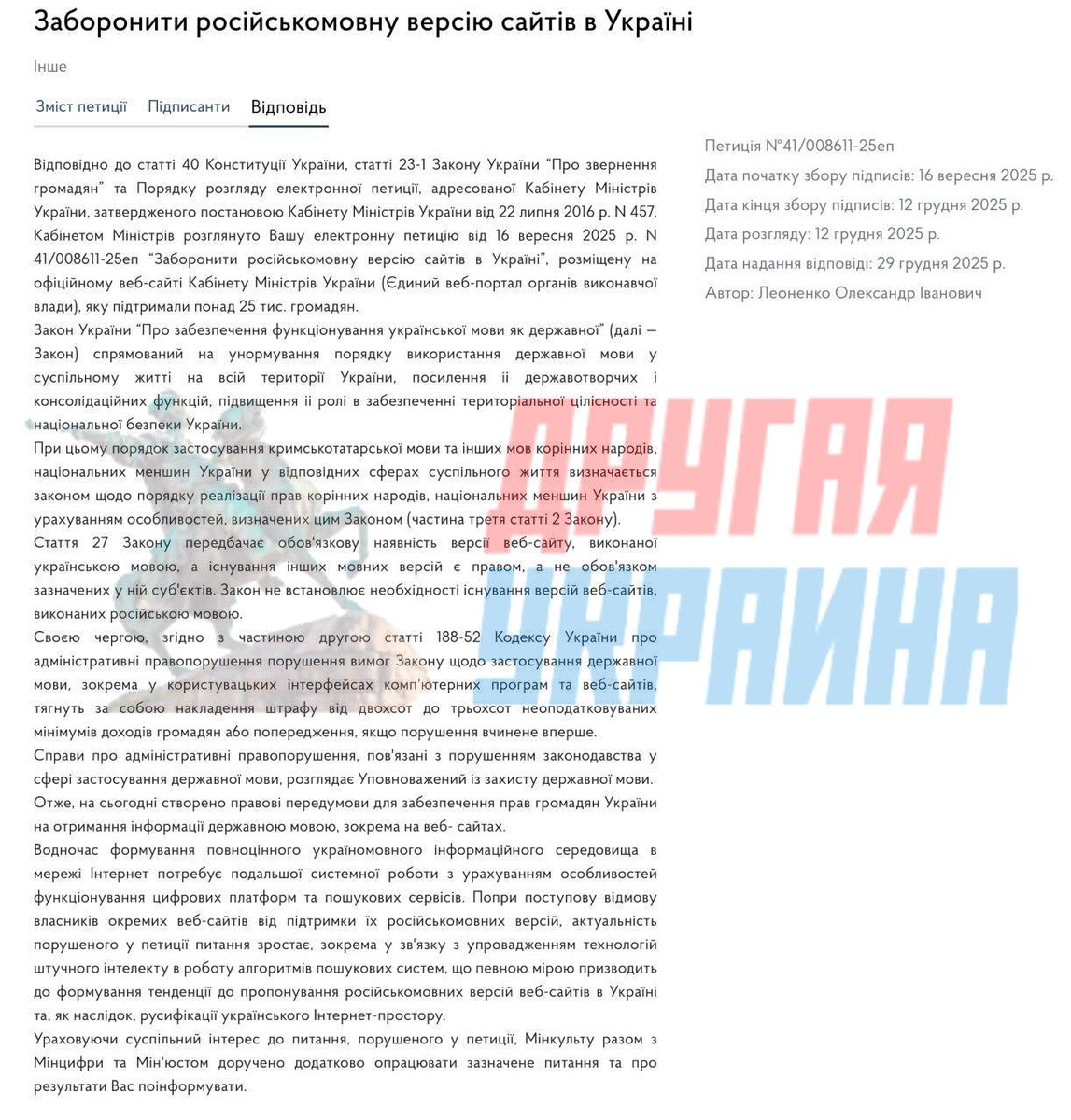 Первый вице-премьер Украины Юлия Свириденко ответила на петицию о запрете русскоязычных версий веб-ресурсов. Несмотря на отсутствие законодательной базы для полного запрета прямо сейчас, правительство начинает глубокую проработку этого вопроса. На данный момент обязательным является наличие украинской версии сайта (по умолчанию). Отсутствие украиноязычного интерфейса карается штрафами. Свириденко отметила, что алгоритмы поисковых систем и внедрение искусственного интеллекта часто предлагают пользователям именно русскоязычный контент, что способствует «русификации» цифрового пространства. Сайт "Другая Украина" / Telegram / Вконтакте / Центр поддержки Украинцев / Жалоба на ТЦК 🇷🇺"Другая Украина" теперь в МАХ