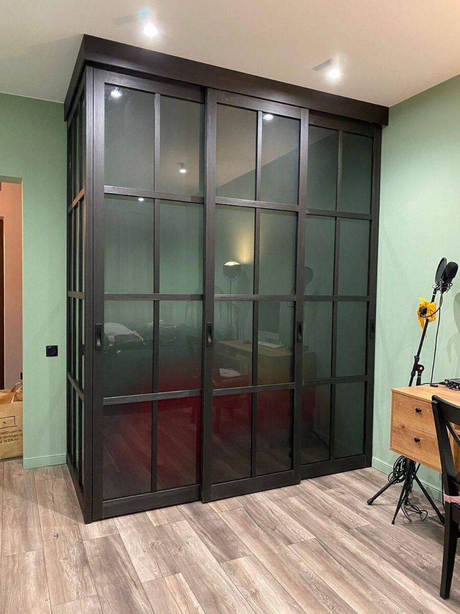 И даже не шкаф. Это отдельно стоящая гардеробная с наполнением — такой формат мы тоже реализуем. Сбоку — стационарная створка, спереди — две откатные. Материал — дерево, покрытие экошпон, цвет венге. Стекло — матовое графит. Гардеробная становится частью интерьера, а не просто местом хранения. ✅Как вам такой формат?