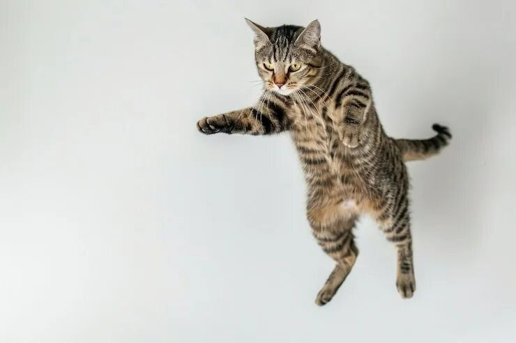 - Кошки способны подпрыгнуть на высоту, в 5–6 раз превышающую их собственный рост. Секрет — в мощных задних лапах и гибком позвоночнике, позволяющем эффективно «сжиматься» и «распрямляться» как пружина.