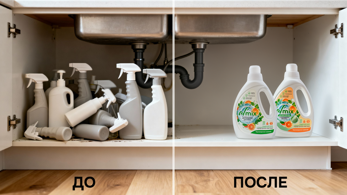 Под раковиной часто живет «химический архив»: наполовину пустые бутылки, дублирующие друг друга средства и флаконы «на всякий случай». Такой запас не делает дом чище — наоборот, усложняет уборку и хранение. Как навести порядок быстро?