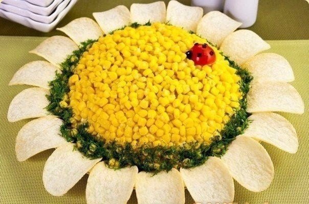 13. Выложить кукурузу. По кругу воткнуть чипсы.