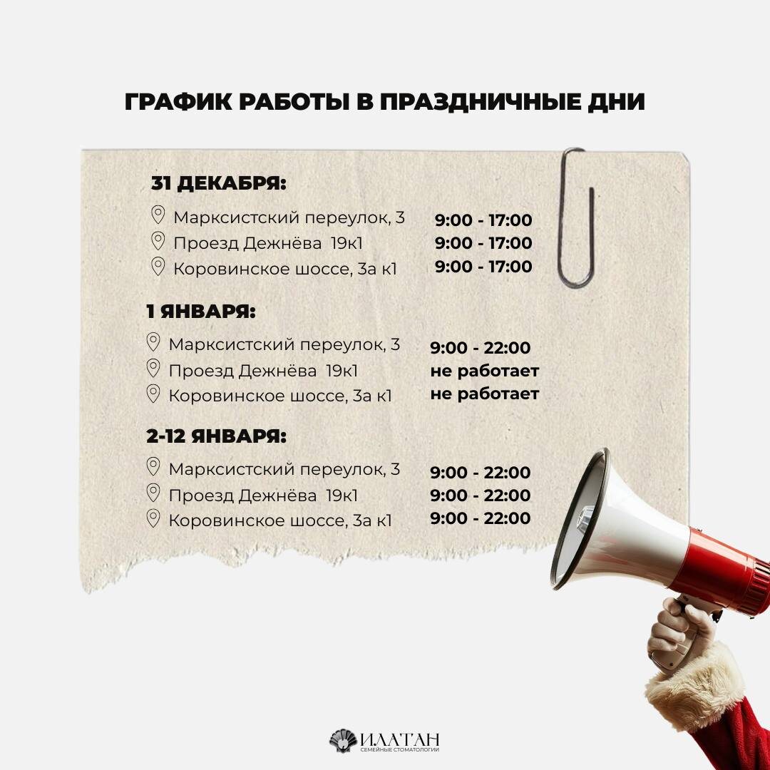 ΠΠΎΡΠΎΠ³ΠΈΠ΅ ΠΏΠ°ΡΠΈΠ΅Π½ΡΡ, ΡΠΏΠ΅ΡΠΈΠΌ ΠΏΠΎΠ·Π΄ΡΠ°Π²ΠΈΡΡ Π²Π°Ρ Ρ Π½Π°ΡΡΡΠΏΠ°ΡΡΠΈΠΌ ΠΠΎΠ²ΡΠΌ Π³ΠΎΠ΄ΠΎΠΌ! π₯π Π ΡΠ°ΠΊΠΆΠ΅ Π½Π°ΠΏΠΎΠΌΠ½ΠΈΡΡ ΠΎ ΡΠΎΠΌ, ΠΊΠ°ΠΊ ΡΠ°Π±ΠΎΡΠ°ΡΡ Π½Π°ΡΠΈ ΠΊΠ»ΠΈΠ½ΠΈΠΊΠΈ Π² ΠΏΡΠ°Π·Π΄Π½ΠΈΡΠ½ΡΠ΅ Π΄Π½ΠΈ π π31 Π΄Π΅ΠΊΠ°Π±ΡΡ: Π²ΡΠ΅ ΠΊΠ»ΠΈΠ½ΠΈΠΊΠΈ ΡΠ°Π±ΠΎΡΠ°ΡΡ Ρ 9:00 Π΄ΠΎ 17:00. π1 ΡΠ½Π²Π°ΡΡ: ΡΠ°Π±ΠΎΡΠ°Π΅Ρ ΡΠΎΠ»ΡΠΊΠΎ ΠΊΠ»ΠΈΠ½ΠΈΠΊΠ° Π½Π° ΠΠ°ΡΠΊΡΠΈΡΡΡΠΊΠΎΠΌ ΠΏΠ΅ΡΠ΅ΡΠ»ΠΊΠ΅ Ρ 9:00 Π΄ΠΎ 22:00. π2-12 ΡΠ½Π²Π°ΡΡ: Π²ΡΠ΅ ΠΊΠ»ΠΈΠ½ΠΈΠΊΠΈ ΡΠ°Π±ΠΎΡΠ°ΡΡ Π² ΠΏΡΠ΅ΠΆΠ½Π΅ΠΌ ΡΠ΅ΠΆΠΈΠΌΠ΅ Ρ 9:00 Π΄ΠΎ 22:00. πstomatologia-ilatan.ru