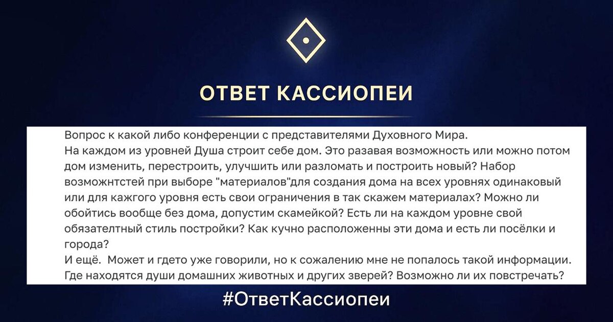 ❓ Здравствуйте. Вопрос к какой либо конференции с представителями Духовного Мира. На каждом из уровней Душа строит себе дом. Это разавая возможность или можно потом дом изменить, перестроить, улучшить или разломать и построить новый? Набор возможнтстей при выборе "материалов"для создания дома на всех уровнях одинаковый или для кажгого уровня есть свои ограничения в так скажем материалах? Можно ли обойтись вообще без дома, допустим скамейкой? Есть ли на каждом уровне свой обязателтный стиль постройки? Как кучно расположенны эти дома и есть ли посëлки и города? И ещё. Может и гдето уже говорили, но к сожалению мне не попалось такой информации. Где находятся души домашних животных и других зверей? Возможно ли их повстречать? Спасибо. ✨ Дом в Духовном мире можно менять и перестраивать по желанию Духа, так как он создаётся силой мысли. Набор «материалов» не физический, а энергетический и ограничен вибрациями души на конкретном уровне. Духам не обязательно иметь дом — можно обойтись любой