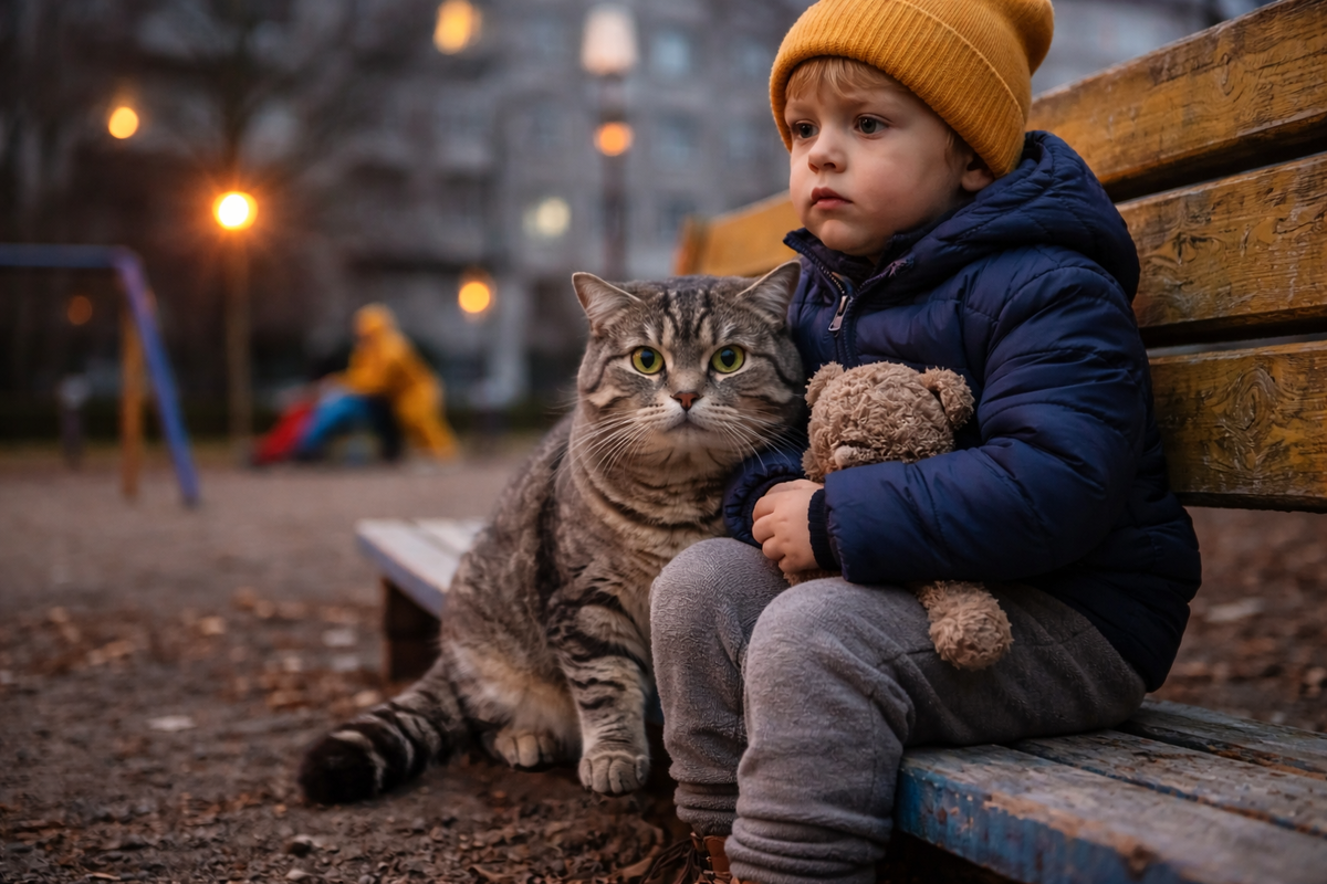 Кот не “влюбился”. Не “прилип”. Не “случайно рядом оказался”. Он взял ребёнка под охрану. Потому что ребёнок живёт в доме, где взрослые заняты собой. Где громкий голос — норма. Где тишина — редкость. Где “мама устала” означает “мама исчезла”.