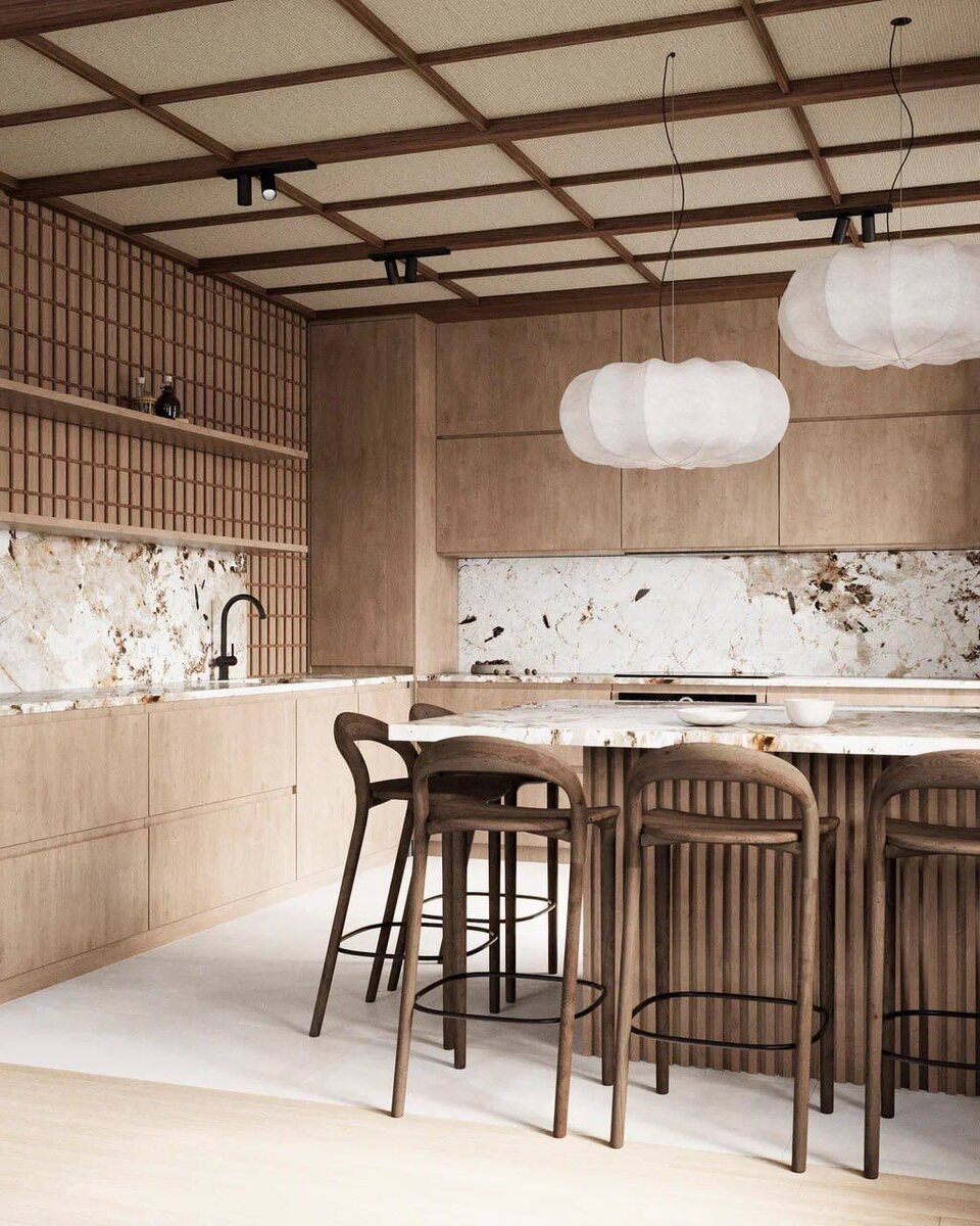 ². Дизайн-проект с деликатными отсылками к японской эстетике. В основе концепции — спокойствие и выверенные пропорции в пространстве. Мы работали не с образом Японии, а с её философией: тишина, ритм, тактильность и функциональность без лишнего. Основные принципы проекта: — натуральные материалы и сложные древесные оттенки; — чистая геометрия, скрытые системы хранения, визуальная дисциплина; — ритм вертикалей и горизонталей, который задаёт ощущение порядка; — мягкий рассеянный свет, создающий глубину, а не эффектность. Интерьер построен на балансе. Камень и дерево, матовые поверхности, тактильные фактуры. Ничего случайного — каждая деталь работает на общее ощущение собранности и спокойной уверенности. Планировочные решения подчинены логике жизни заказчика: пространство не демонстрирует себя, оно поддерживает. Нет визуального шума, нет лишних акцентов — интерьер остаётся актуальным и через годы. Этот проект — про состояние. Про дом, в котором легко дышать, думать и восстанавливатьс