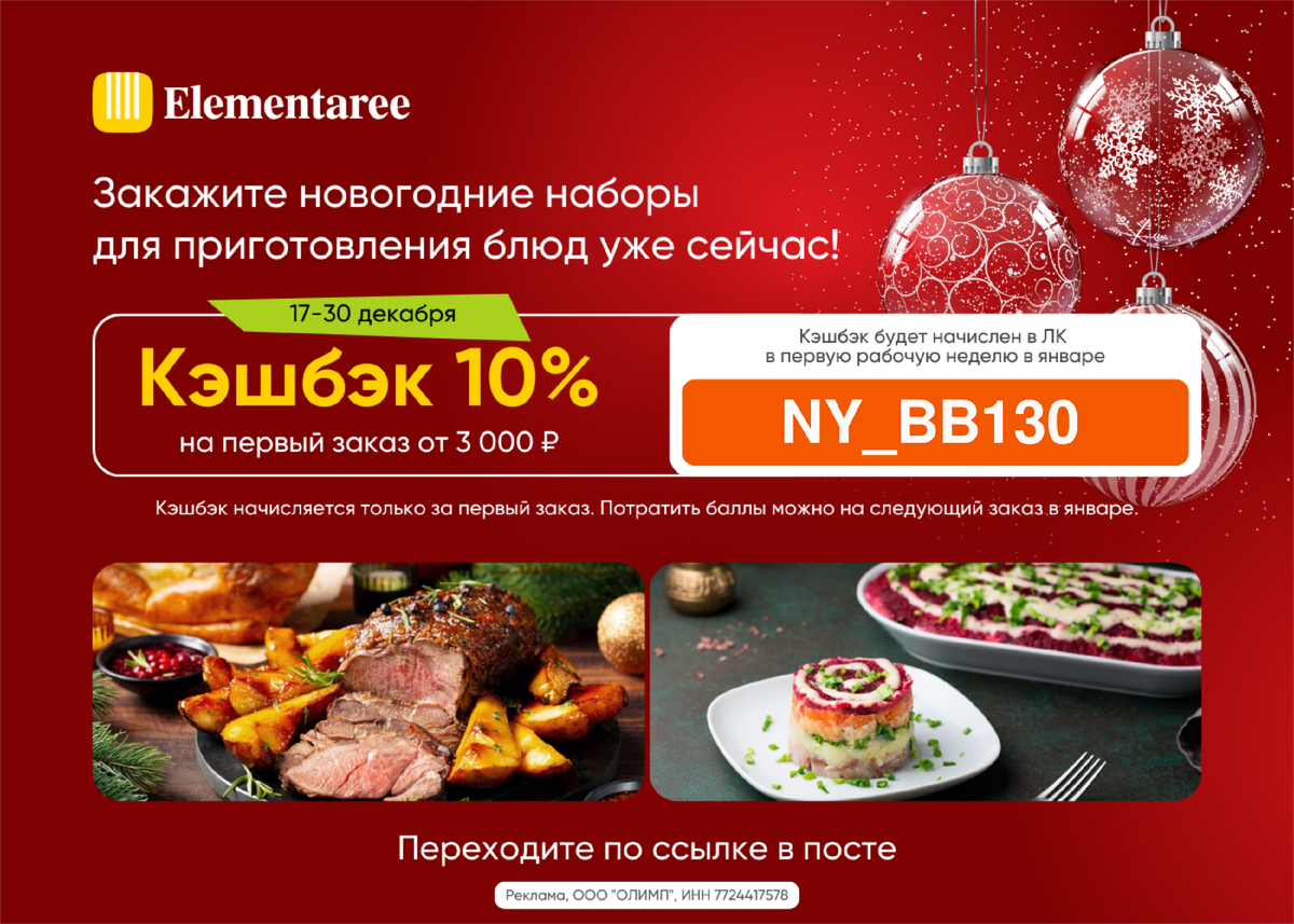 в Elementaree до 30 декабря действует кэшбэк* 10% за первый заказ при заказе блюд из Новогоднего меню от 3000 ₽ по промокоду👉